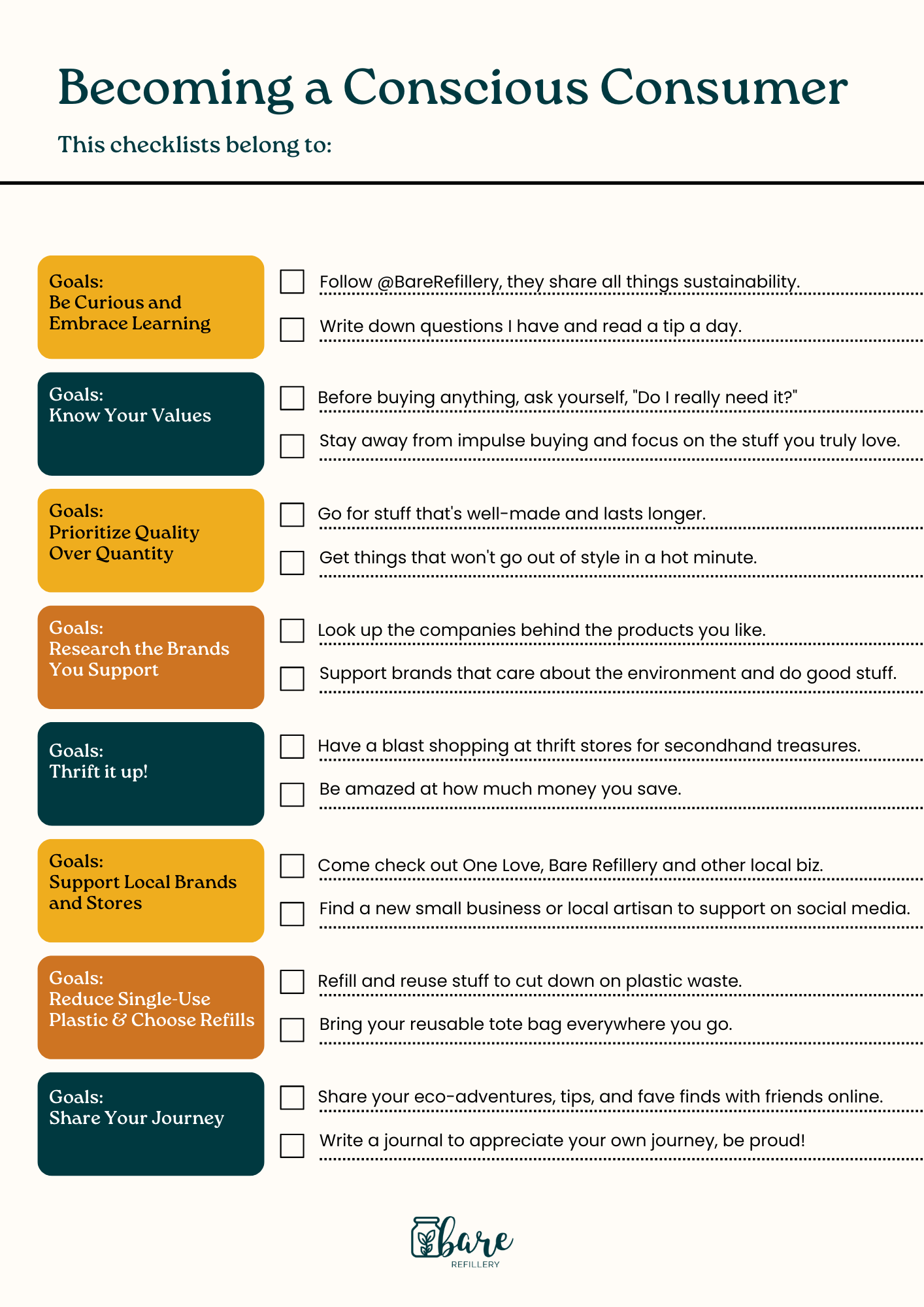 ☐ Follow @BareRefillery as we love to share all things sustainability.